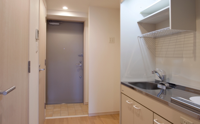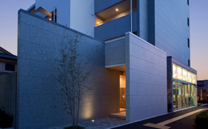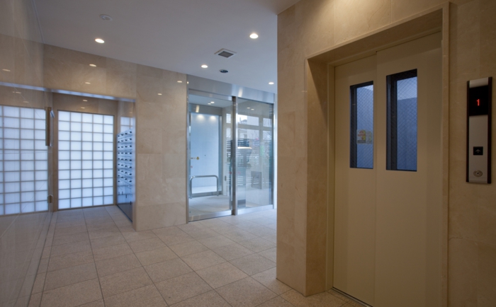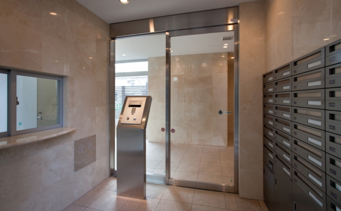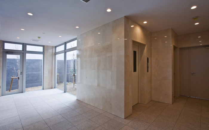 石やガラスブロックを使いホテルのロビーのような空間に仕上げました。各世帯も白を基