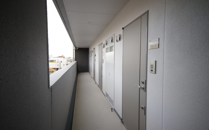 外部:西面と東面はシンプルな壁(板)のデザインとし、南面の各世帯には開放的で大きな窓を