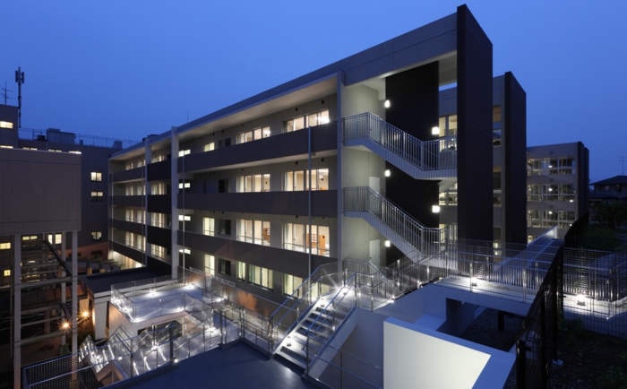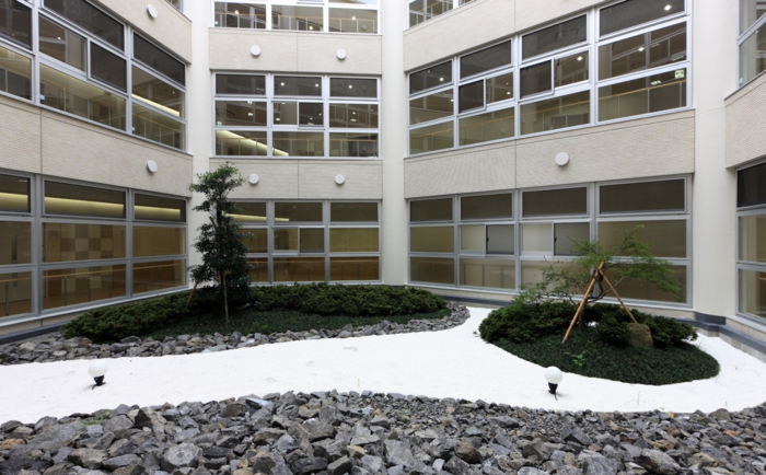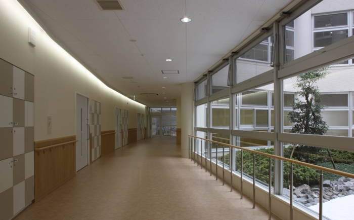 敷地の段差ある形状を利用して各フロアーの構成を計画しました。各病棟は食堂(公園)・廊下